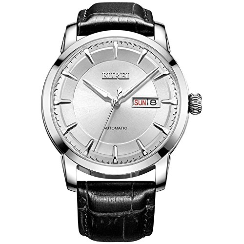 Best Seller! BUREI® Men's Day and Date Automatic Watch with Black Calfskin Band, Silver Bezel White Dial Review