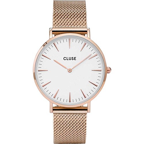 This ladies Cluse La Boheme Mesh watch is made from PVD rose plating and is powered by an analogue quartz movement. It is fastened with a rose metal bracelet and has a white dial.