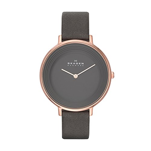 This ladies Skagen Ditte Relaxed watch has a PVD rose plating case and is powered by a quartz movement. It is fitted with a grey leather strap and has a grey dial.