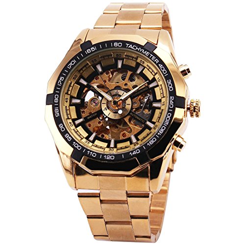 iTECHOR offer Wrist Watch, iTECHOR Men's Hollow Out Skeleton Dial Steel Strap Self-Wind Mechanical Wrist Watch - Golden. This awesome product currently limited units, you can buy it now for £17.99, You save -